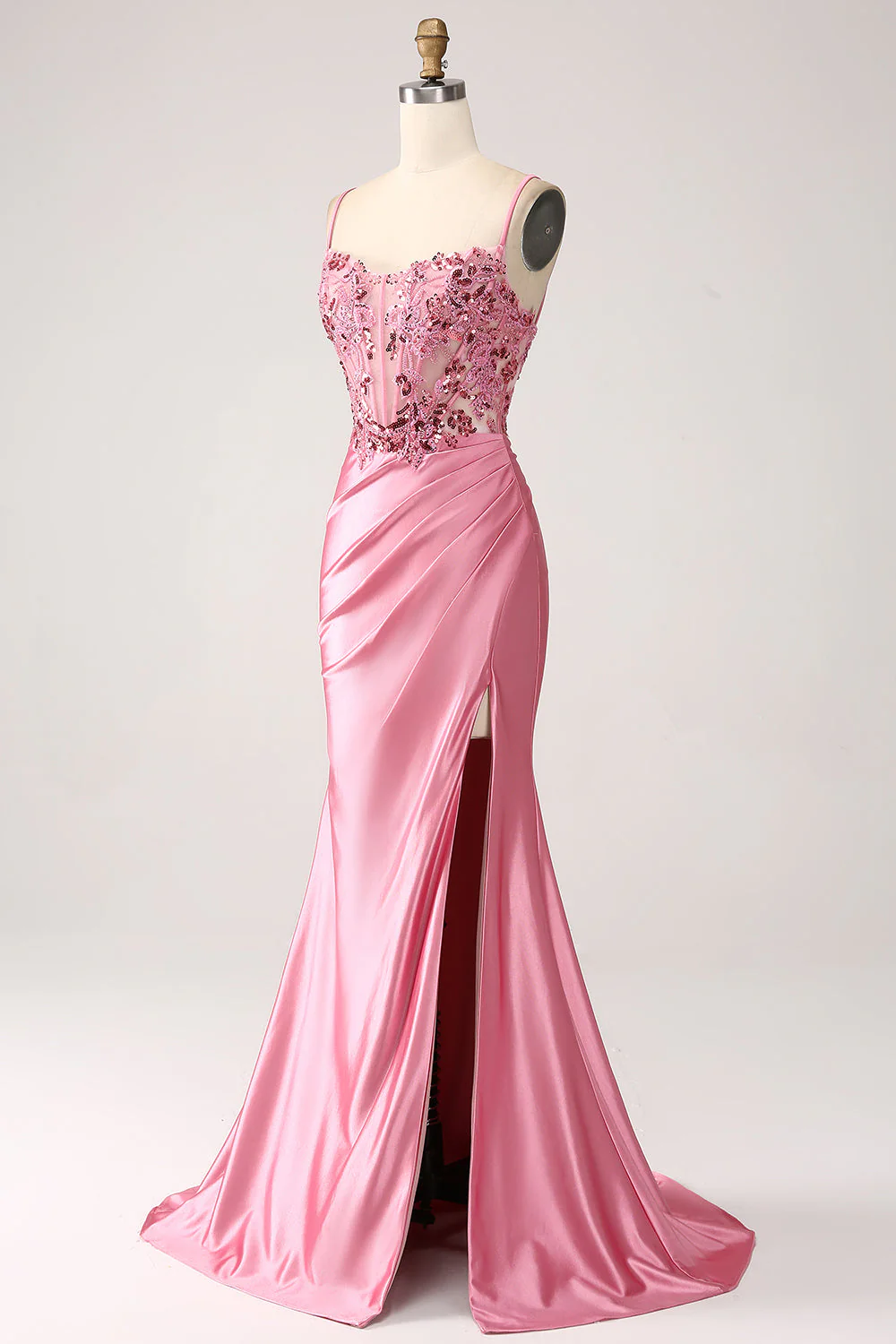 Pink Mermaid Spaghetti Straps Sequin Corset Prom Dress with Slit